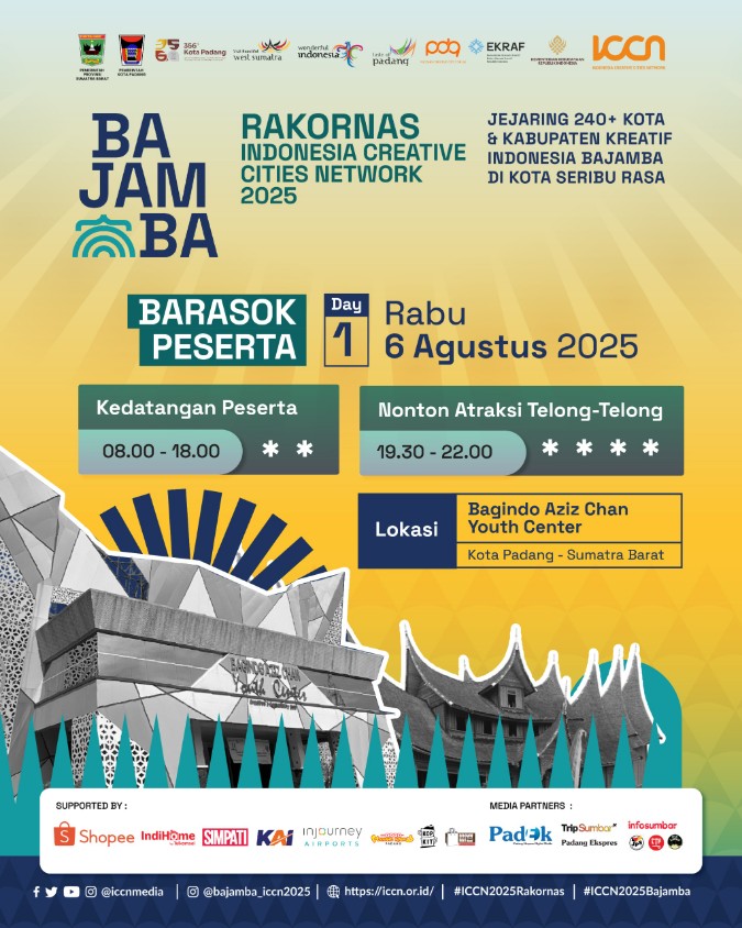 Andalas Time,Padang – Gelaran Rapat Koordinasi Nasional (Rakornas) Indonesia Creative Cities Network (ICCN) resmi dimulai, Rabu (6/8). Ratusan jejaring kreatif dari berbagai daerah di Indonesia menyerbu Kota Padang, disambut hangat dengan nuansa khas Minangkabau.