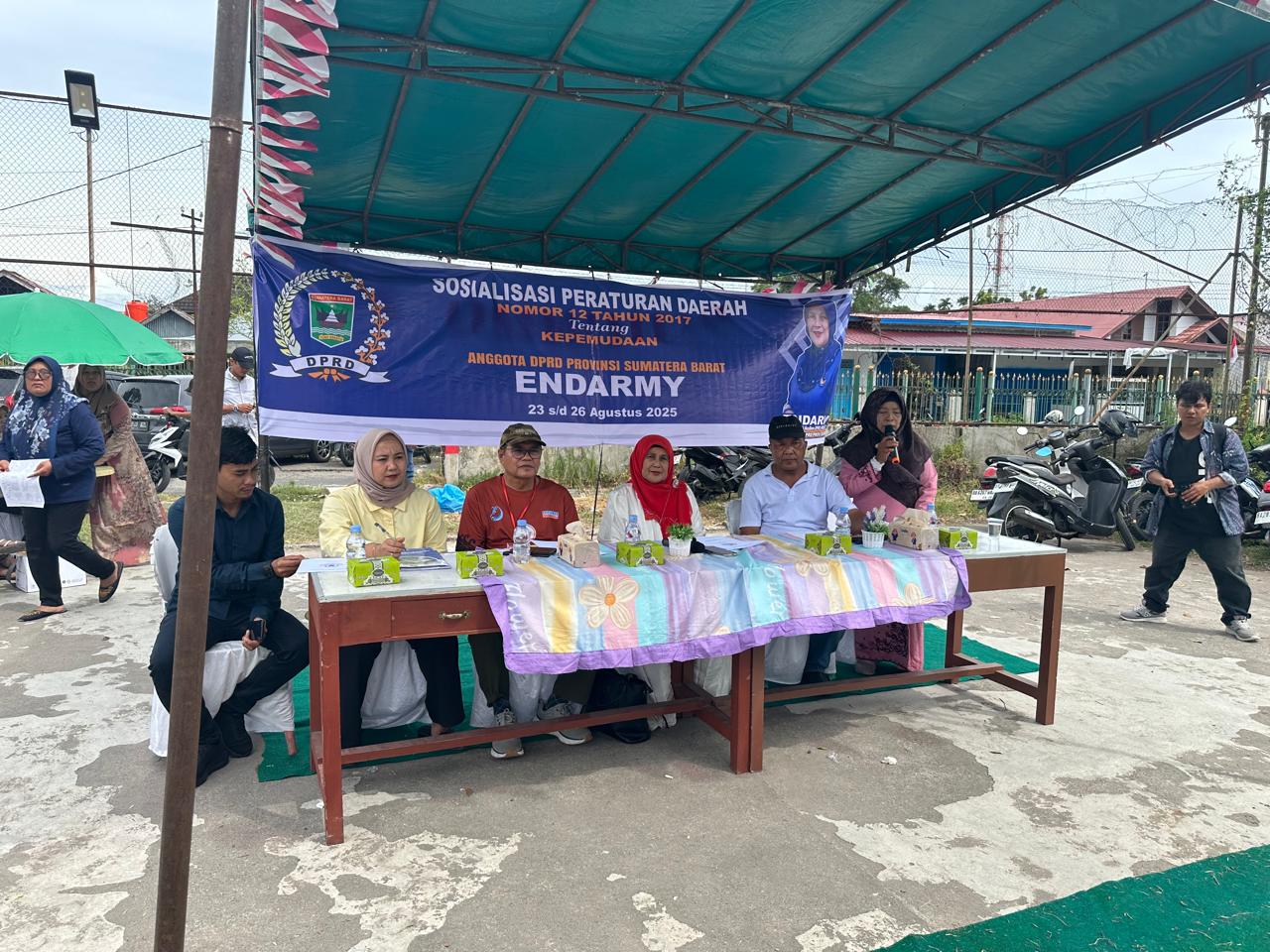 Andalas Time,Padang Pariaman – Anggota Komisi V DPRD Provinsi Sumatera Barat (Sumbar), Endarmy, menggelar sosialisasi Peraturan Daerah (Perda) Nomor 12 Tahun 2017 tentang Kepemudaan, Senin (25/8). Dalam kesempatan itu, ia mengingatkan generasi muda agar menjauhi segala bentuk perbuatan yang merugikan diri sendiri maupun orang lain, karena bisa berujung pada ranah hukum.
