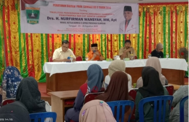 Andalas Time,Solok Selatan- Wakil Ketua Komisi V Dewan Perwakilan Rakyat Daerah (DPRD) Provinsi Sumatera Barat Drs. H. Nurfirman Wansyah, A. Pt. MM melakukan sosialisasi Peraturan Daerah (Perda) nomor 9 tahun 2018 tentang Fasilitasi Pencegahan Penyalahgunaan Narkotika, Psikotropika dan Zat Adiktif (NAPZA) di Wisma Umi Kalsum, Kecamatan Sungai Pagu, Kabupaten Solok Selatan, Senin (25/8/2025).