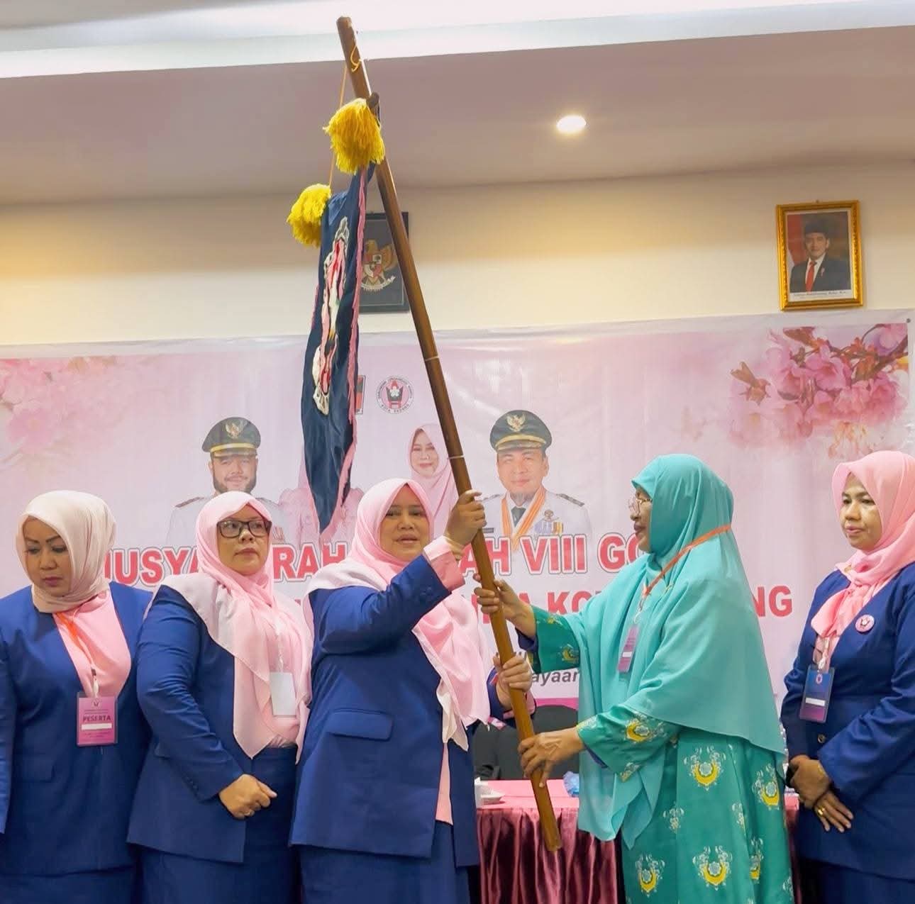 Setelah terpilih secara aklamasi, Ny Srihayati Maigus Nasir kemudian mengibarkan bendera pataka GOW di depan seluruh pengurus. Seluruh pengurus akan dilantik dalam waktu dekat.(Ch)