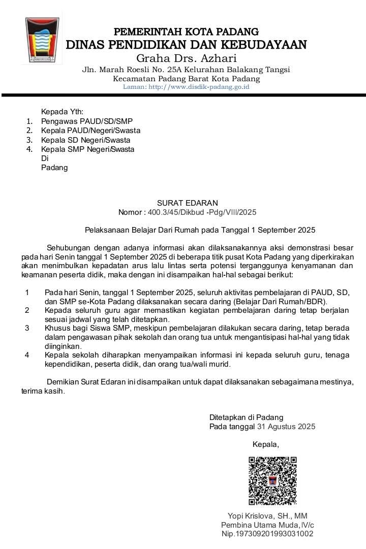 Surat edaran belajar dari rumah bernomor 400.3/45/Dikbud-Pdg/VIII/2025. Surat itu ditandatangani Kadis Pendidikan dan Kebudayaan pada tanggal 31 Agustus 2025.(Ch)
