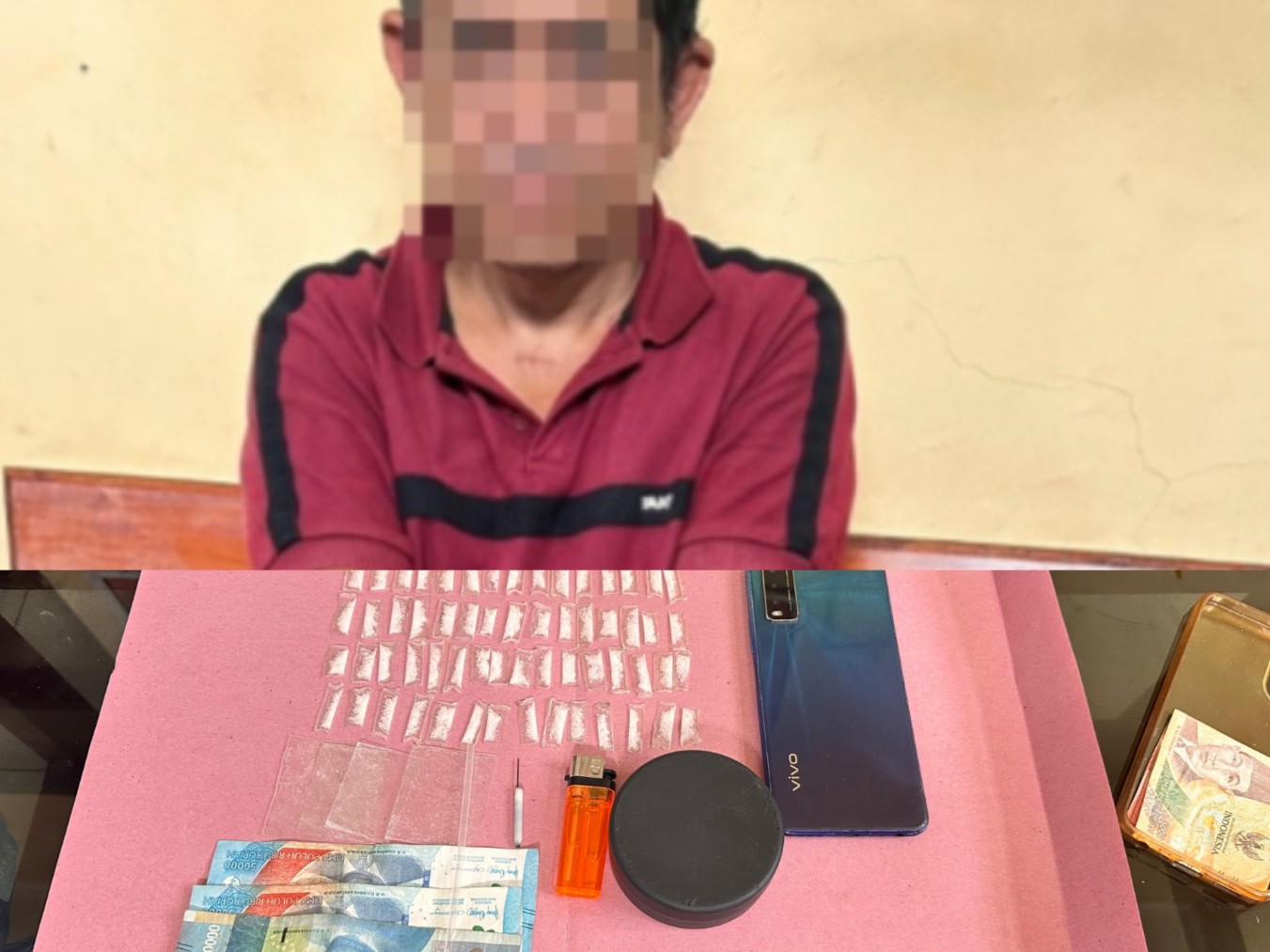 Dia menjelaskan, adapun barang bukti yang berhasil disita dari tangan pelaku berupa 60 paket Narkotika jenis sabu-sabu yang dibungkus dengan plastik warna bening, satu unit handphone merk Vivo warna biru.