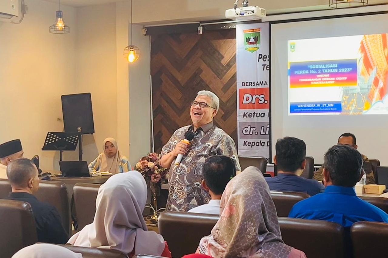 Andalas Time,Padang – Ketua DPRD Sumatera Barat, Muhidi, melaksanakan Sosialisasi Peraturan Daerah (Sosper) Nomor 2 Tahun 2023 tentang Pengembangan Ekonomi Kreatif pada Sesi ke-2 di Padang, Sabtu (25/10/2025). Kegiatan tersebut dihadiri Kepala Bidang Ekonomi Kreatif Dinas Pariwisata Sumbar, Wahendra, serta pelaku ekonomi kreatif dari berbagai kecamatan di Kota Padang.