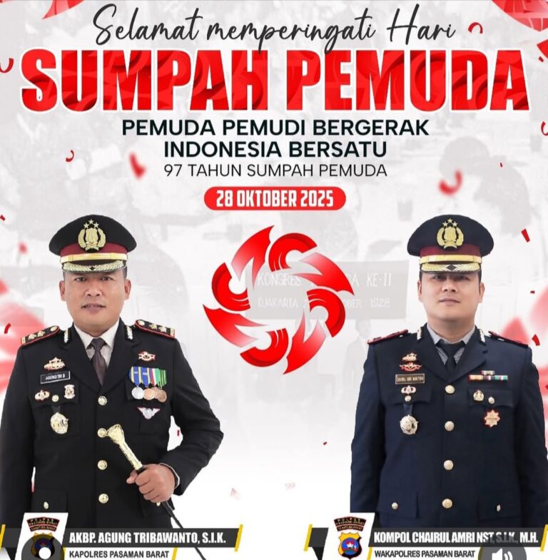 Andalas Time,Pasaman Barat – Dalam rangka memperingati Hari Sumpah Pemuda ke-97, yang jatuh pada 28 Oktober 2025, jajaran Polres Pasaman Barat bersama masyarakat menyuarakan satu pesan yang menggugah: pemuda harus menjadi motor penggerak perubahan bangsa.