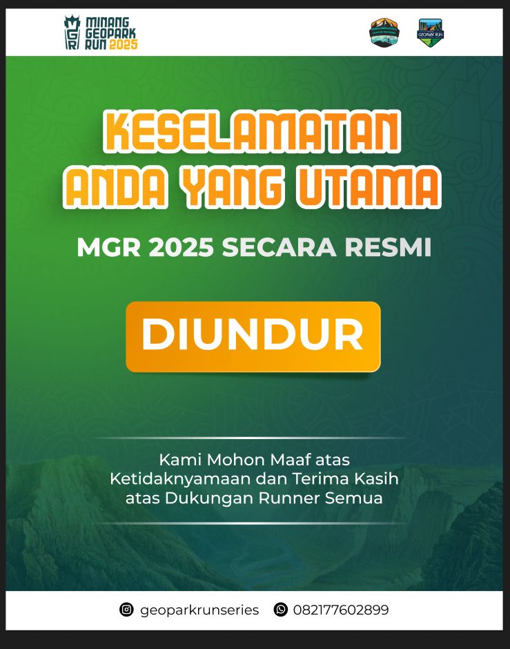 Andalas Time,Sumbar – Sehubungan dengan terjadinya musibah banjir di Sumatera Barat, dengan berat hati, kami panitia Minang Geopark Run, Pihak Otorita dan beserta seluruh pihak terkait mengambil keputusan untuk menunda gelaran Minang Geopark Run 2025.