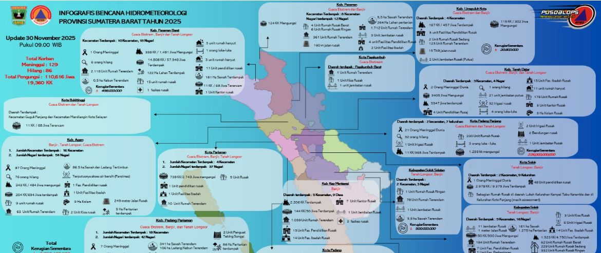 Andalas Time,Sumbar –  Pemerintah Provinsi Sumatera Barat (Pemprov Sumbar) melalui Pusdalops BPBD kembali merilis pembaruan data korban bencana hidrometeorologi yang melanda sejumlah daerah sejak 21 November 2025. Hingga Minggu (30/11) pukul 09.00 WIB, tercatat 129 orang meninggal dunia dan 86 orang masih dinyatakan hilang.