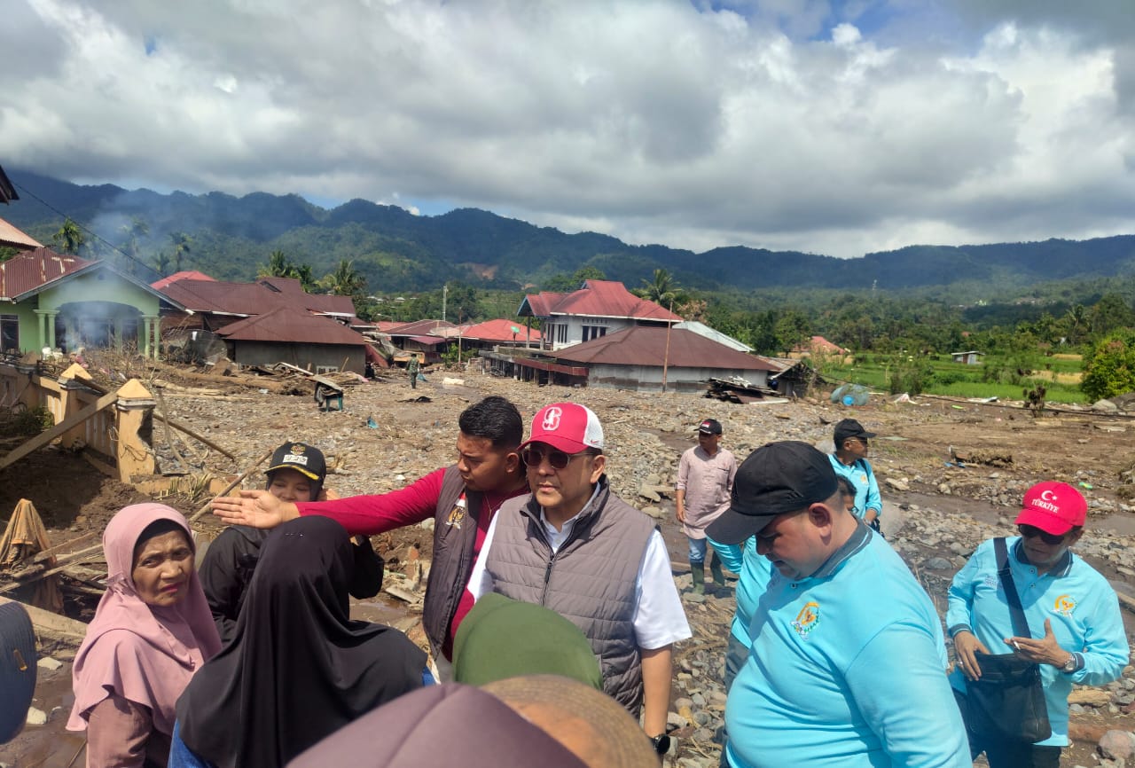 Didampingi Camat Malalak Ulya Satar serta unsur pemuda dan KNPI Agam, Irman berkeliling ke beberapa titik untuk menemui para pengungsi dan warga yang sedang berupaya membersihkan bekas rumah mereka yang dihantam galodo pada Rabu (26/11/2025) petang.