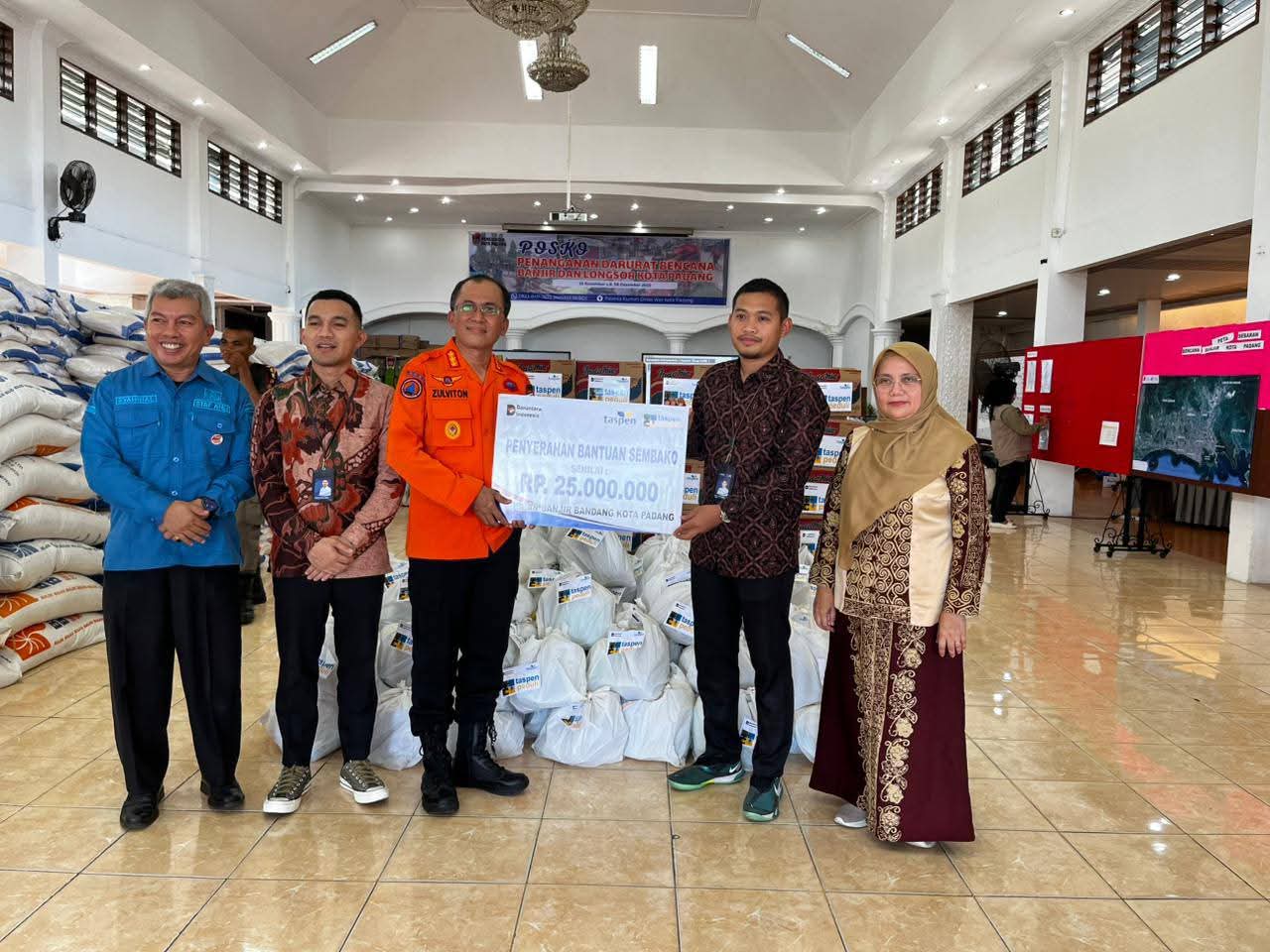 Pada Kamis (4/12/2025), Badan Usaha Milik Negara (BUMN) Tabungan dan Asuransi Pensiun(Taspen) Kota Padang turut menyumbangkan bantuan berupa 108 paket sembako untuk para korban.