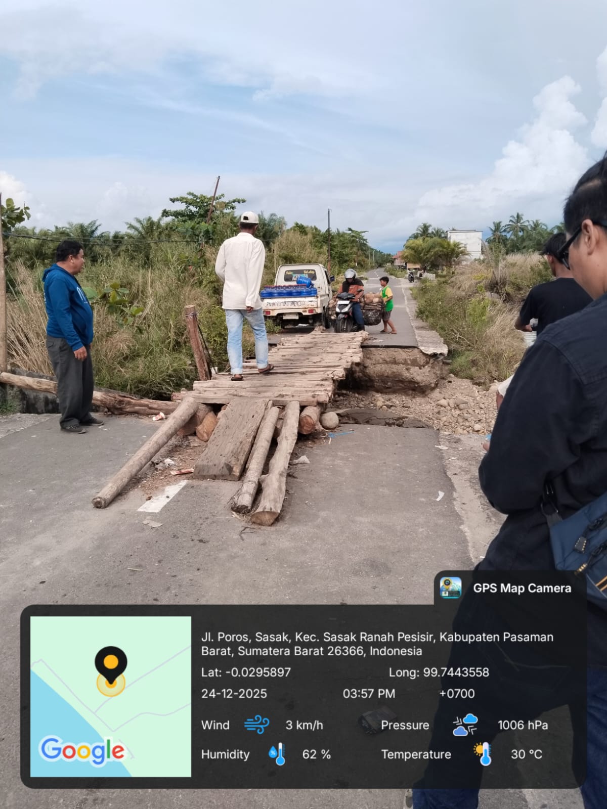 Langkah Darurat yang Diambil,Warga dibantu TNI dan Polri membangun jembatan sementara dari pohon kelapa untuk sepeda motor, meski belum aman untuk kendaraan roda empat. BPBD Pasaman Barat memperpanjang tanggap darurat hingga 29 Desember sambil memvalidasi kerusakan 13 jembatan rusak termasuk yang ke Pohon Seribu