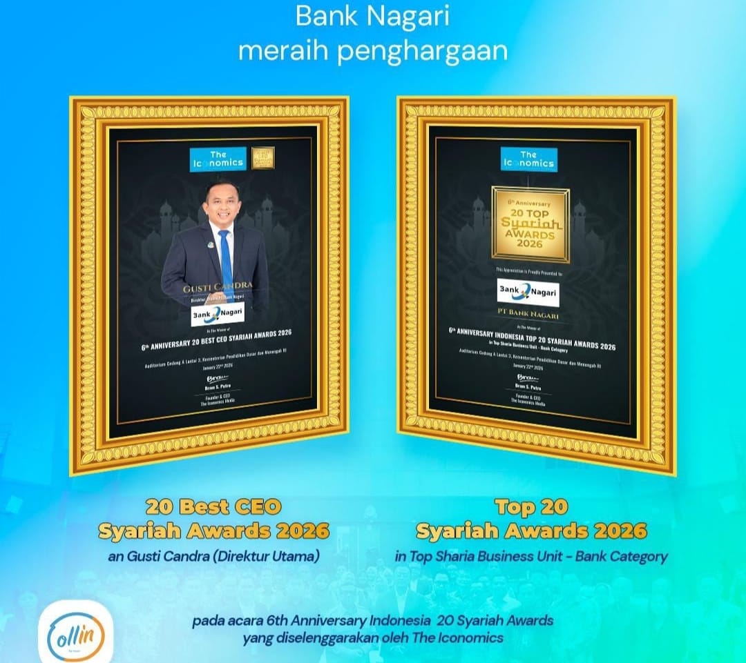Dua penghargaan prestisius yang diraih yakni Indonesia 20 Top Syariah Awards 2026 untuk Unit Usaha Syariah (UUS) Bank Nagari, serta 20 Best CEO Syariah Awards 2026 yang dianugerahkan kepada Gusti Candra sebagai Direktur Utama Bank Nagari.