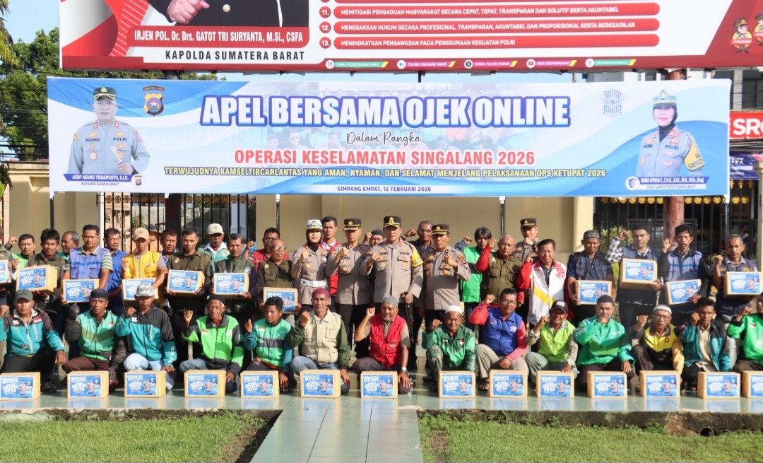 Kapolres Pasaman Barat AKBP Agung Tribawanto yang membacakan amanat Kapolda Sumbar mengatakan, kegiatan apel bersama ojek online seiring dengan pelaksanaan Operasi Keselamatan Singgalang 2026.