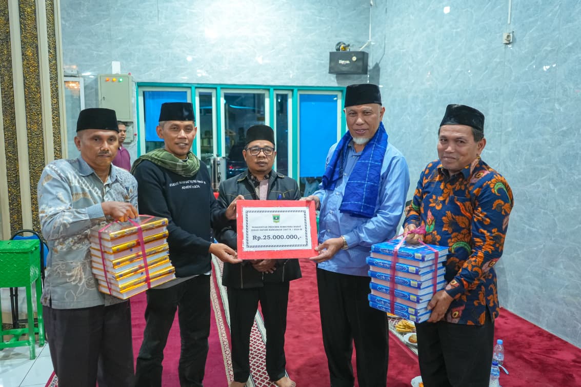 Dalam kesempatan itu, Gubernur Mahyeldi menyerahkan bantuan hibah sebesar Rp25 juta untuk mendukung rehabilitasi masjid, serta 20 mushaf Al-Qur’an wakaf dari ASN Pemerintah Provinsi Sumbar.