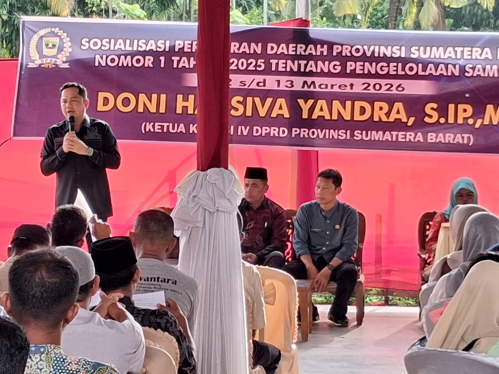 Andalas Time,Pesisir Selatan — Ketua Komisi IV DPRD Provinsi Sumatera Barat, Doni Harsiva Yandra, melaksanakan kegiatan sosialisasi Peraturan Daerah (Perda) Nomor 8 Tahun 2018 tentang Pengelolaan Sampah Regional di Posko Kelompok Tani Batu Tapak, Kampung Koto Merapak, Nagari Padang XI Punggasan, Kecamatan Linggo Sari Baganti, Kabupaten Pesisir Selatan, Jumat (13/3/2026).