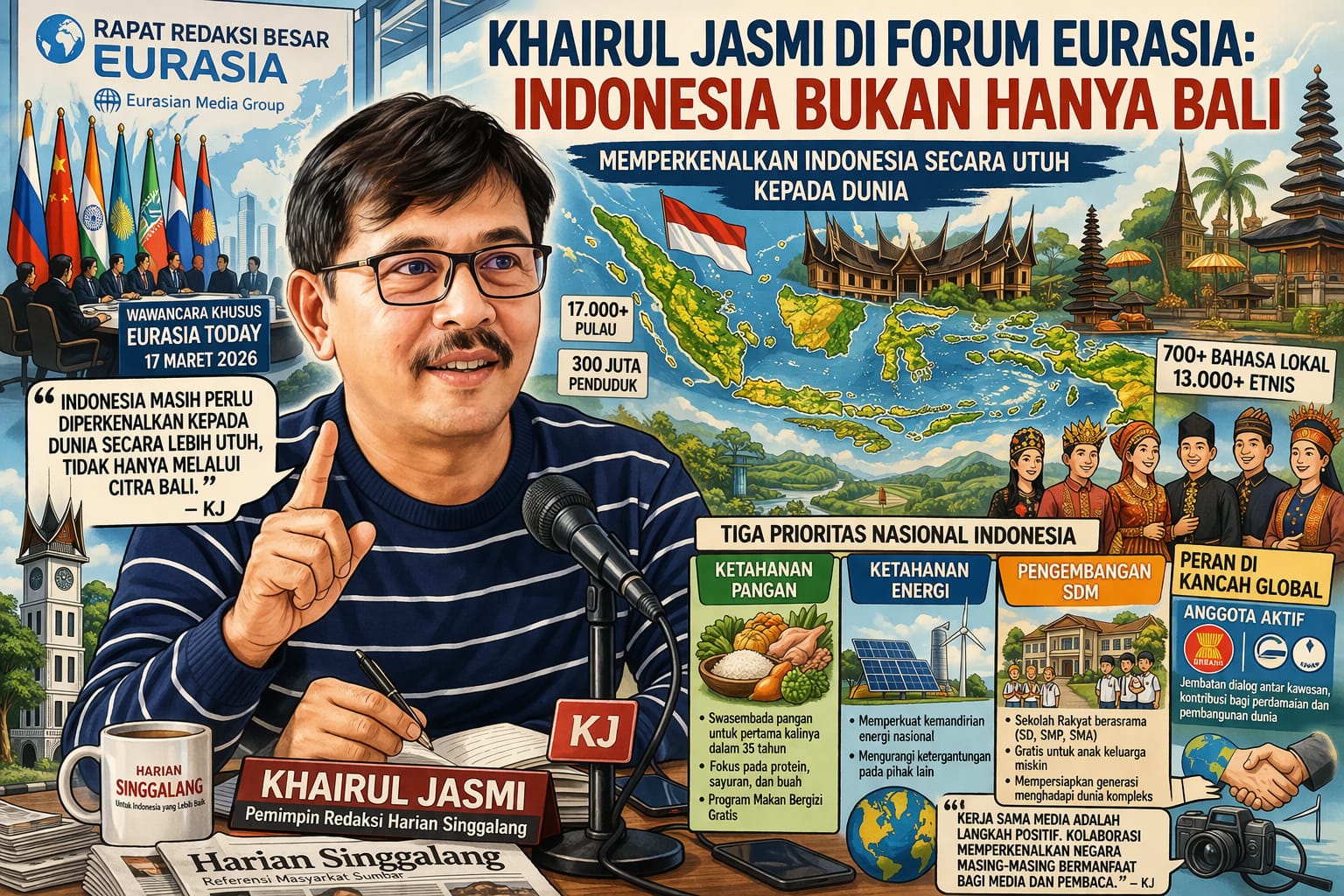 Andalas Time,Padang, — Pemimpin Redaksi Harian Singgalang, Khairul Jasmi, menegaskan bahwa Indonesia perlu diperkenalkan kepada dunia secara lebih utuh dan tidak hanya dikenal melalui citra Bali. Pandangan itu disampaikannya dalam wawancara khusus proyek internasional “Rapat Redaksi Besar Eurasia” yang digelar Eurasian Media Group dan dipublikasikan oleh Eurasia Today pada 17 Maret 2026.