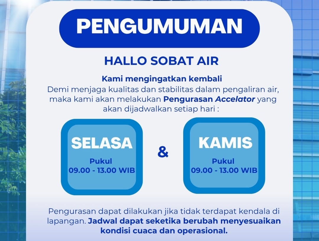 Kegiatan pemeliharaan ini dijadwalkan berlangsung setiap hari Selasa dan Kamis, mulai pukul 09.00 WIB hingga 13.00 WIB. Selama proses berlangsung, aliran air ke sejumlah wilayah dipastikan akan mengalami gangguan, mulai dari tekanan yang menurun hingga potensi terhentinya suplai sementara.