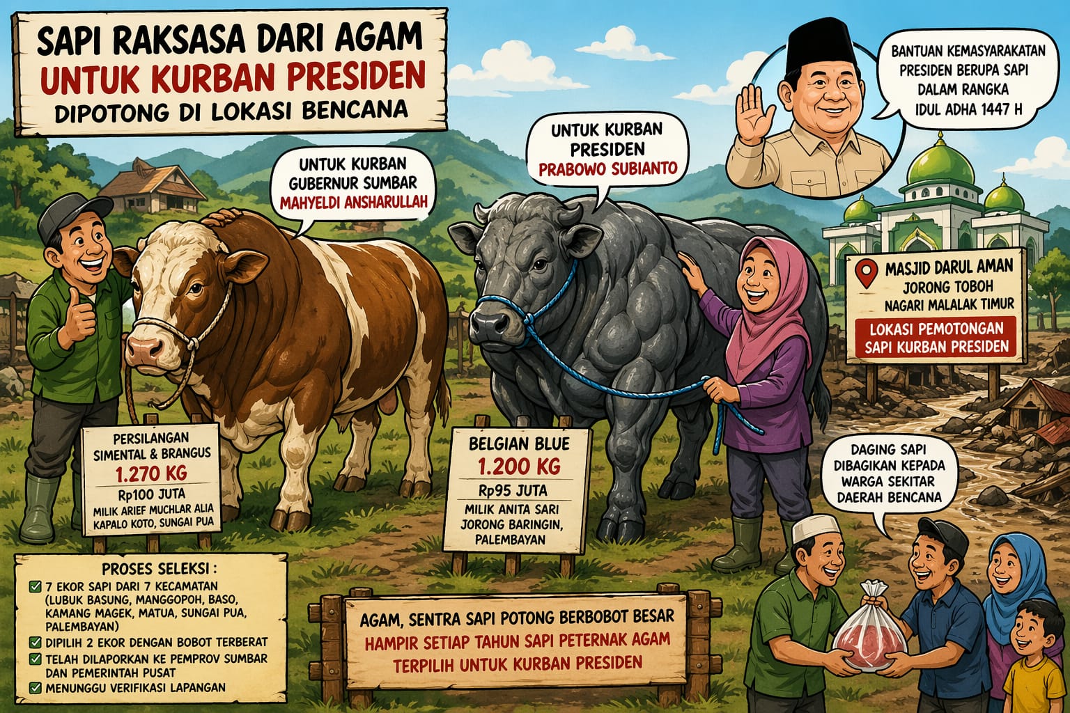 Andalas Time,Agam — Di kandang-kandang peternak lereng bukit dan lembah Agam, dua sapi berbobot jumbo kini menjadi perhatian. Hewan kurban pilihan itu disiapkan Pemerintah Kabupaten Agam untuk Hari Raya Idul Adha 1447 Hijriah. Salah satunya diproyeksikan menjadi hewan kurban Presiden Prabowo Subianto dan akan dipotong di kawasan terdampak bencana hidrometeorologi.